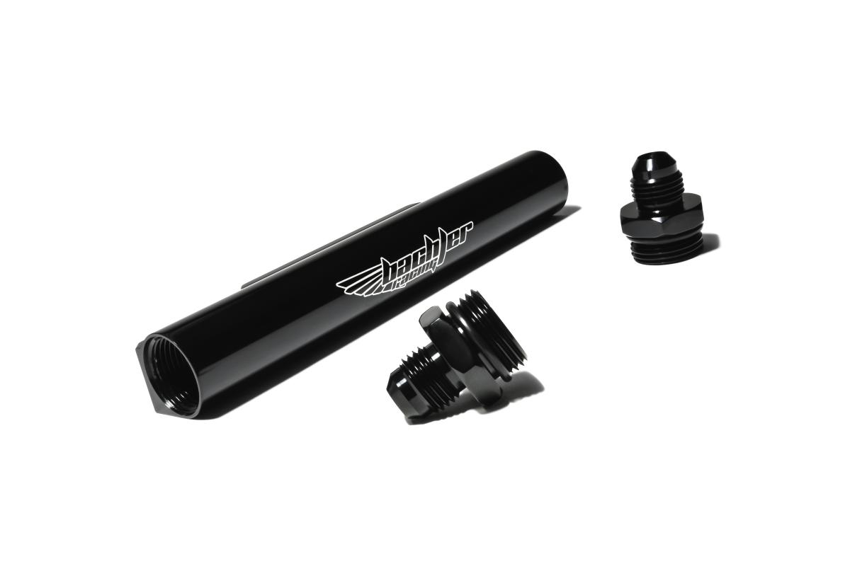 Bachler Racing fuel rails have been specifically developed for this purpose, not only do they offer the ability to connect aeroquip hose and fittings to each end (therefore forming a new fuel feed line) but they also offer a much larger capacity for fuel storage above the feed into the injector. With limitless possibilities of fittings available for each end of the fuel rails this also offers flexibilty where space is comprimised when installing rotated turbo kits.